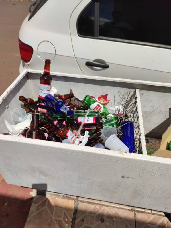 Pessoas que costumam tomar bebidas nas imediações da Rua Teresa Verseri, estão deixando as garrafas e copos plásticos soltos em uma lixeira que pertence a um consultório odontológico, que está localizado na referida rua.